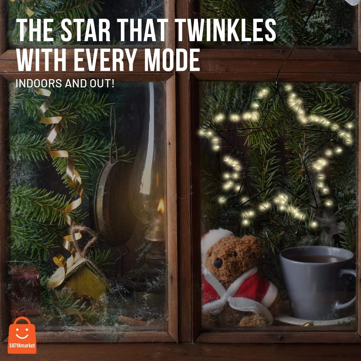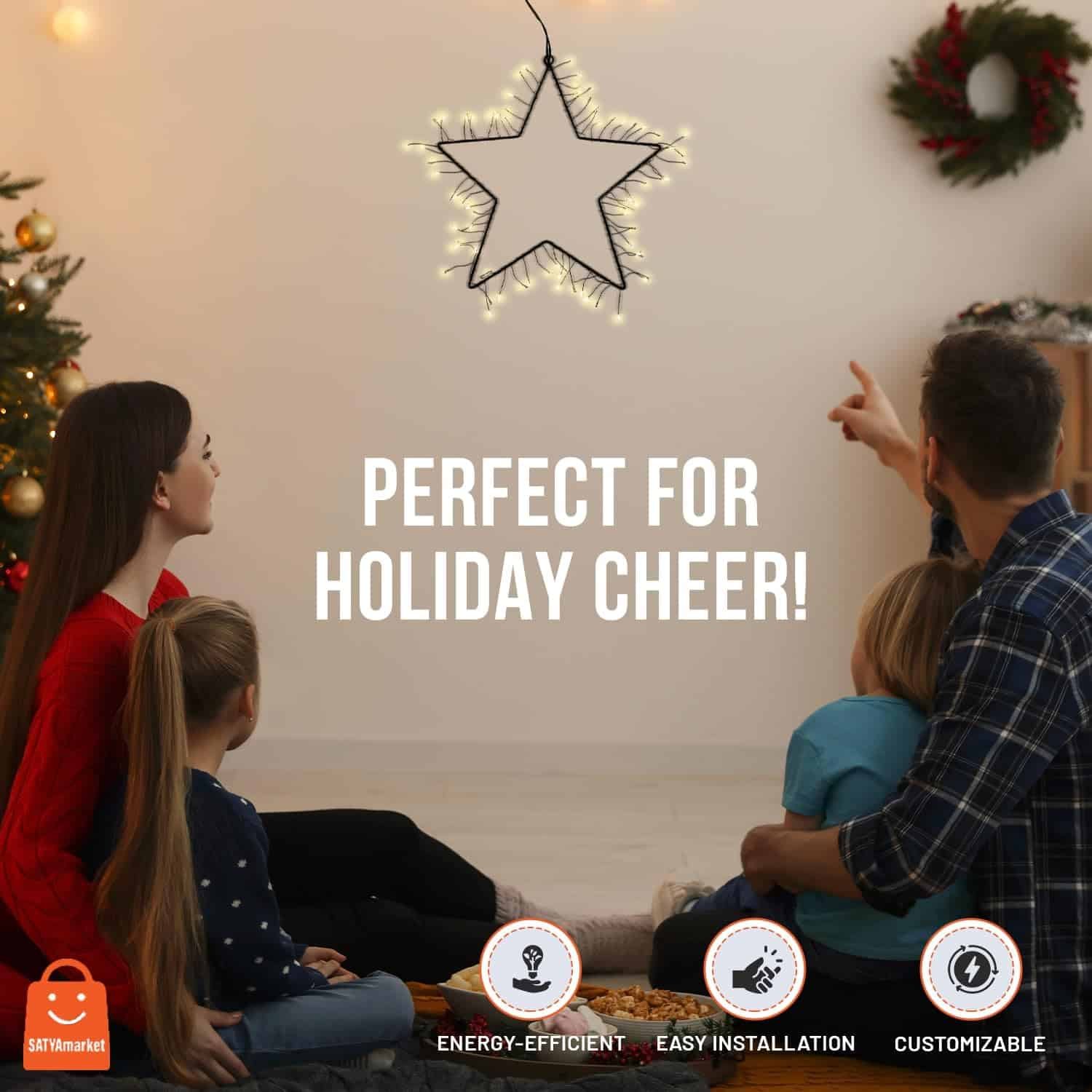 Illuminate your festive celebrations with Satyamarket stunning Christmas Star Light. Featuring a 30cm metal star adorned with 85 warm white LEDs on a black copper wire, it brings a cozy glow to your home or outdoor space.