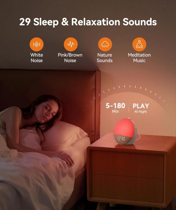 • 𝗦𝗹𝗲𝗲𝗽-𝗥𝗲𝗮𝗱𝘆 𝗦𝗼𝘂𝗻𝗱𝘀 & 𝗟𝗶𝗴𝗵𝘁𝘀: When sleep feels out of reach, let the sound machine guide you into rest. It’s packed with 29 soothing sounds—rain, white noise, ocean waves—each crafted to lull your mind into calm and mask distractions. Pair with 10 ambient RGB lights: warm yellow for gentle pre-sleep comfort, muted blue for serene quiet. Together, they create the perfect sleepy atmosphere to help you drift off smoothly.